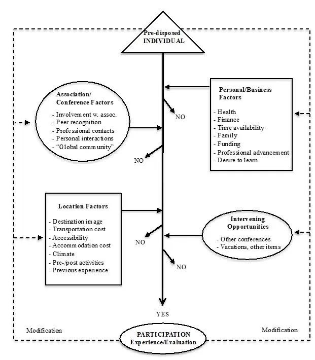 Oppermann and Chung (1997) were the first who developed a conceptual framework for decision-making of participation in conventions. This model represents how different variables influence the decision-making of potential attendees. Personal or business factors, association or conference factors, location factors, and intervening factors are the four main factors that influence an individual’s decision-making process when attending a conference. The figure below represents the conference participation decision-making process.