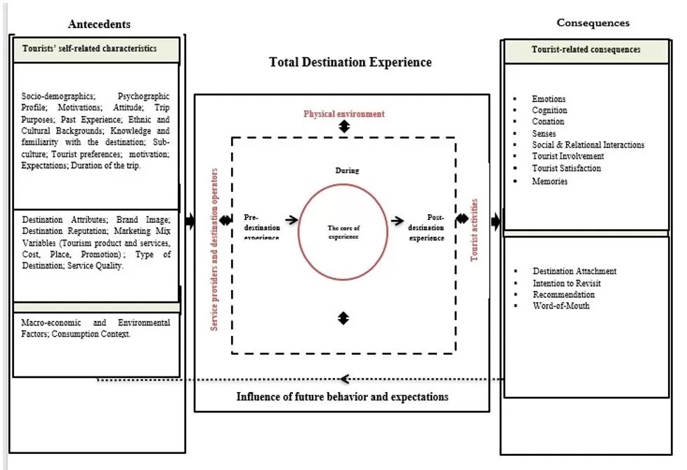 Nowadays, with the increasing worldwide competition and the changing situation the world lives in due mainly to the post-pandemic period, the global economic crisis, and the emergence of a new form of technologies and behaviors, tourist destinations are not spared from these challenges. To adapt to these changes and maintain their position in the market, the tourism industry players need to develop and reinvent their tourism. Understanding their experiential offerings is therefore prominent to accomplish this. According to Pine and Gilmore (1999), the core value of destinations lies in the quality of the experience it offers. This experience can be strong that tourists might develop a deep emotional bond with their travel destination (Hidalgo & Hernandez, 2001) and influence their behavioral intentions (Prayag et al., 2017; del Bosque & San Martin, 2008). Nevertheless, limited studies address a comprehensive framework of what makes an overall tourist experience in the destination or implicitly depict the antecedents, formations, and consequences of the tourist experience in the destination (Cetin et al., 2019; Karayilan & Cetin, 2016). It is, therefore, within this context where this conceptual paper is located.