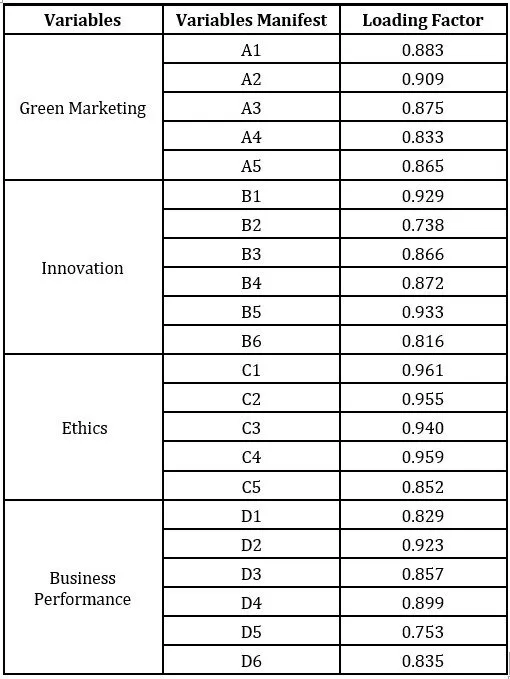 According to the data in the table above, each manifest variable’s loading factor value is more than 0.7 for all indicators, which means that all indicators are considered valid and capable of measuring variables correctly.