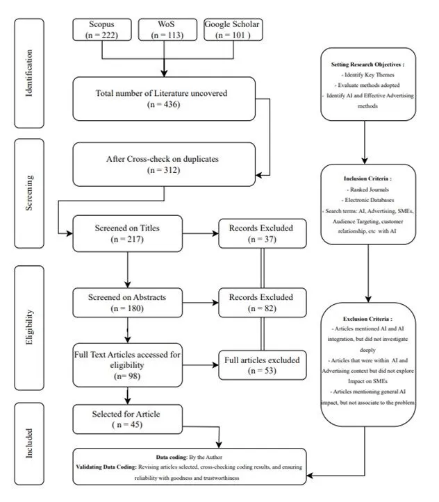 The author conducted an extensive secondary data analysis to explore Artificial Intelligence’s role in modifying SMEs’ advertising campaigns and strategies. This process was important to define key variables before developing a survey questionnaire. Figure 1 outlines the process of how available literature was screened and filtered.