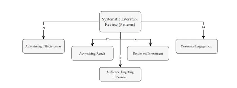 Furthermore, after excluding duplicates, the author screened literature on research titles. This is a critical part of the process, as many articles have effective research titles, but are not relevant with content. Title screening resulted in excluding 37 articles based on predetermined elements. Nevertheless, the authors screened the remaining articles on abstracts, and 82 articles were excluded. Furthermore, 98 eligible full-text articles were accessed, and 53 were excluded. Accordingly, 45 articles were identified as eligible and included in the research. However, before using articles, they were crosschecked for reliability. Consequently, based on a systematic literature review, the author identified five major patterns (figure 2) such as advertising effectiveness, advertising reach, return on investment, customer engagement, and audience targeting procession. Consequently, based on these patterns, the survey study was developed.