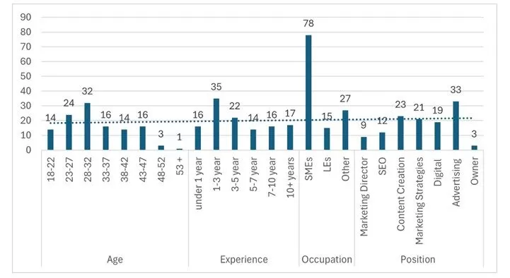 Figure 3 highlights the demographics of the respondents. Most respondents fall between the ages of 23 and 32, which corresponds well with professional experience. Moreover, other age categories also have significance for the study. The vast majority of the respondents had 1-3 years of professional experience in the marketing field. It could also be emphasized that experience distribution is equal, which is an excellent sample representation.