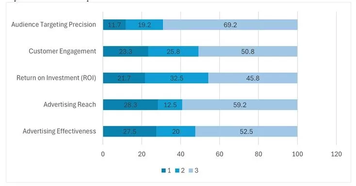 The respondents were asked to rank to what extent AI has an impact on advertising characteristics such as advertising effectiveness, advertising reach, return on investment, customer engagement, and audience targeting procession, with 1 being lowest, and 3 being highest. Figure 4 highlights responses. First, 69.2% of the respondents indicated that AI has a massive impact on audience targeting precision, while 11.7% indicated no impact on advertising strategies. AI improves audience-targeting precision by examining massive datasets more accurately and assisting in predicting user preferences and behaviors more accurately than traditional advertising. Moreover, it personalizes content delivery, optimizes advertising strategies, and improves engagement rates by ensuring the right message goes to the right audience at the right time. Second, 50.8% indicated that AI impacts customer engagement. AI greatly enhances customer engagement by providing personalized interactions, 24/7 support, and more. It encourages brands to foresee customer needs and deliver a timely user experience, improving satisfaction and loyalty. On the contrary, 23.3% do not believe the impact, which is also supported by 25.8% who are not sure of their AI and its power impacting advertising strategies.