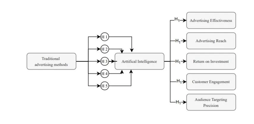 Figure 5 illustrates the synthesis of the variables. The descriptive statistics revealed statistics for advertising characteristics (advertising effectiveness, advertising reach, return on investment, customer engagement, and audience targeting procession) and both methods (AI vs. Traditional). The correlations indicated a strong relationship between both methods and advertising characteristics. Lastly, the regression analysis demonstrated that the advertising methods have a significant impact on the advertising characteristics. Consequently, the author rejected H0 and accepted H1, showing a significant difference in advertising characteristics and SMEs using AI and traditional methods.