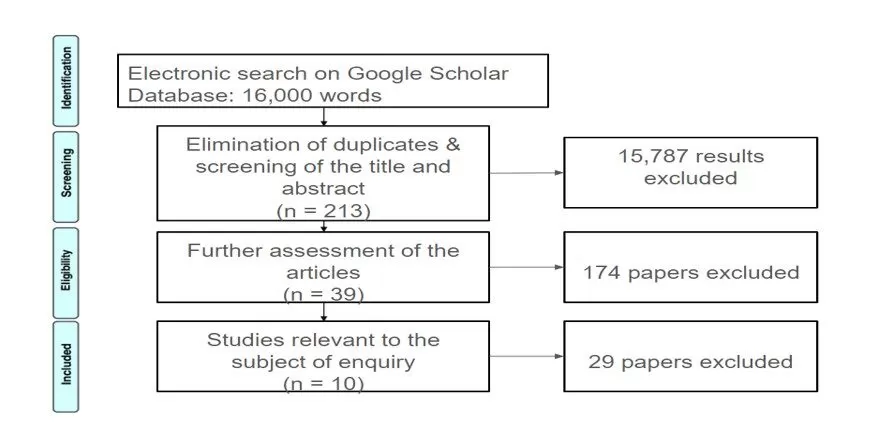 The search on Google Scholar as clarified in the previous section took one week with constant iterations in the search keywords and strings until a total of 10 papers were selected as suitable and valuable for the research. The flow chart of the overall procedure is shown in Figure 1 below: