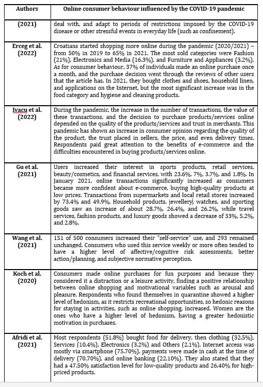 Table 1 – Changes in online consumer behaviour influenced by the COVID-19 pandemic, according to the authors analysed