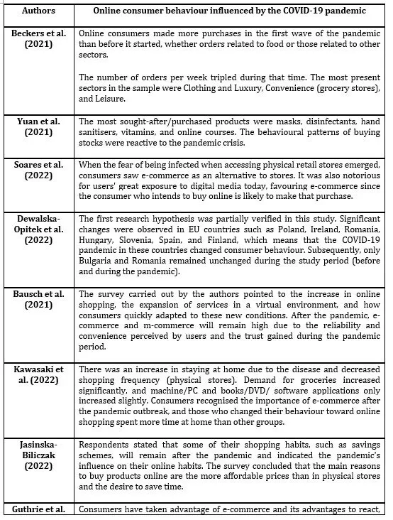 Table 1 presents a summary of the main results obtained by the studies carried out by the authors mentioned above, containing the main changes observed in online consumer behaviour regarding e-commerce, which resulted from the pandemic crisis caused by the COVID-19 disease on a global scale.