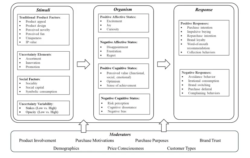 Beyond the three core components of the SOR model, several research studies have examined moderating factors such as consumption purposes (Zhang & Zhang, 2022), product involvement (Zhan & Xiong, 2024), and price consciousness (Gong et al., 2024). Additional moderating variables for future research may include demographic factors such as age and income (Zhang et al., 2022), brand trust and consumer attitudes (Zhan & Xiong, 2024), as well as customer types (actual collectors, first-time consumers, and prospective consumers) (Cruz et al., 2025).