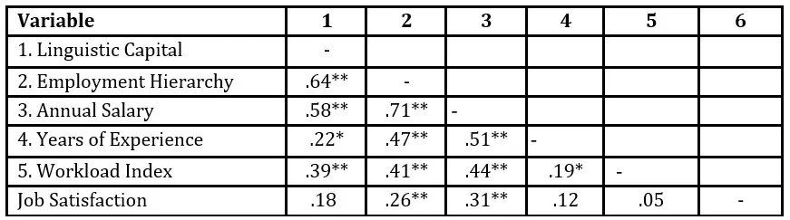 Furthermore, Pearson correlation coefficients were computed for the bivariate relationships among linguistic capital, employment hierarchy, and other job-related variables. Table 2 below shows the summary of the results. The strongest correlation was observed between employment hierarchy and annual salary (r = .71, p < .01). This suggests that higher hierarchical positions are instantly associated with raised compensation. Moreover, linguistic capital also revealed a strong positive correlation with both employment hierarchy (r = .64, p < .01) and salary (r = .58, p < .01). This suggests that multilingual mastery helps in career advancement and earning potential. Furthermore, the results revealed a moderate correlation between workload and hierarchy (r = .41) and between linguistic capital and workload (r = .39). This suggests that multilingual employees frequently have higher responsibilities, presumably due to communication capabilities.