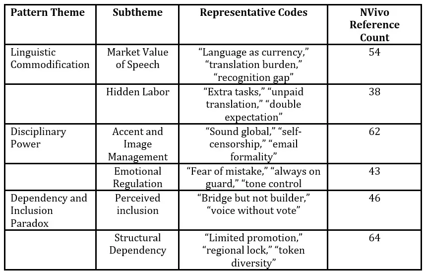 Moreover, Table 6 below shows the coding matrix derived from the thematic analysis. This reveals how raw narrative codes were organized into coherent subthemes and overarching themes, demonstrating the role of multilingualism in corporate contexts. The results revealed three central themes such as Linguistic Commodification, Disciplinary Power, and the Dependency and Inclusion Paradox.