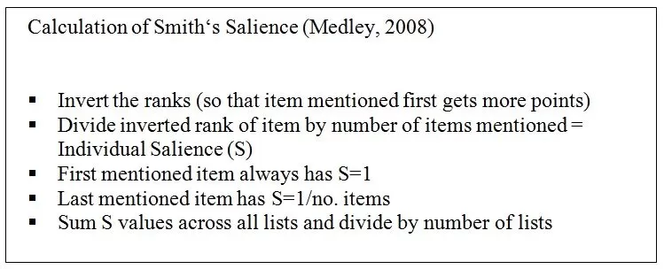 Salience is a statistic accounting for rank and frequency. Frequency indicates common knowledge within a culture. Differences in length and content are measures of intercultural variation. (Medley, 2008). Below are the steps for calculating salience.