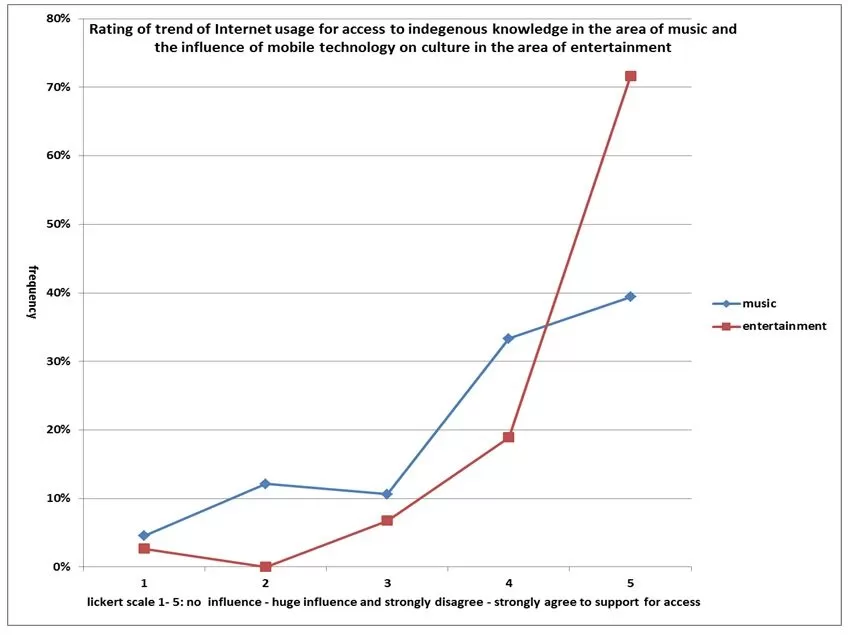 Figure 8 below shows the trend for: Internet support for access to indigenous knowledge in the area of music and influence of mobile technology on culture in the entertainment area.