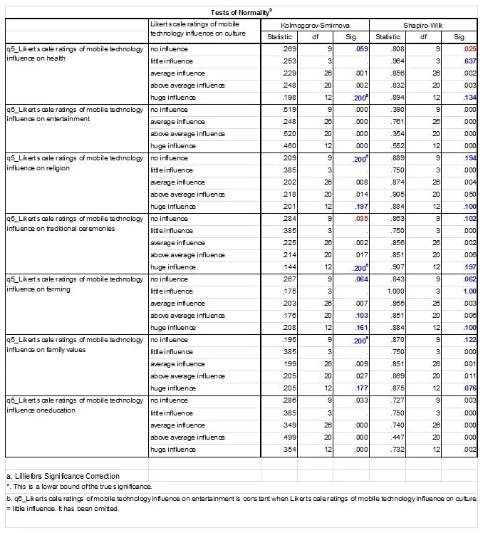 Table 11 presents normality test results for data that rate the influence of mobile technology on culture in specific areas as listed (included are areas that were listed by respondents as attributes of culture), against ratings of the influence of mobile technology on culture as a whole.Sig values for both the Kolmogorov-Smirnova and the Shapiro tests indicate that the dependant variables against the factor variable (influence of technology on culture) are not significantly different to a normally distributed set of figures for the Likert levels whose sig values are in blue or bold font and representing Likert levels on the extreme Likert ratings (no influence and huge influence). These data are thus reliable.