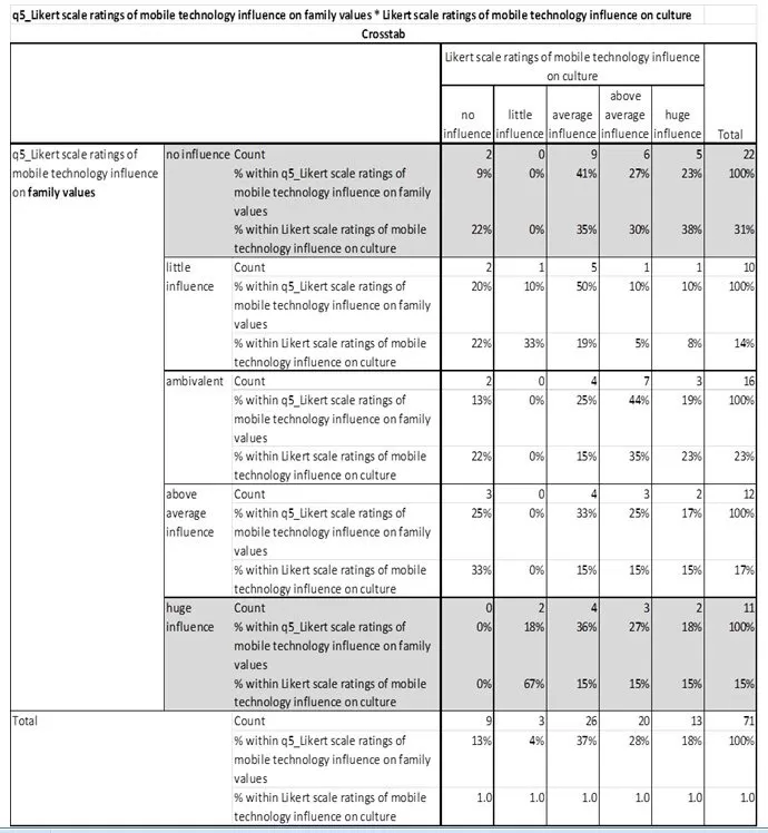 The table indicates that 31% of respondents ranked the influence of mobile technology on culture in the area of family values at “no influence”. In addition, the largest proportion of respondents who ranked the influence of mobile technology on culture as average, above average and huge (37%, 28%, 18%) also ranked the influence of mobile technology on culture in the area of family values, at “no influence” (35%,30%,38%).