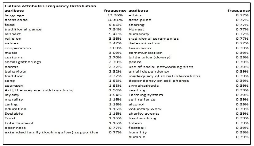 Primary to assessing the respondents’ opinions on the influence of mobile technology on culture was the importance of understanding the context of interpretation by the research survey population, of what culture is. To come up with the context of interpretation, respondents were asked to list any five attributes, activities or characteristics that closely identify with their culture. The resultant data are given in table 2 below. The presented list of culture attributes represents the respondents’ cognitive culture domain.