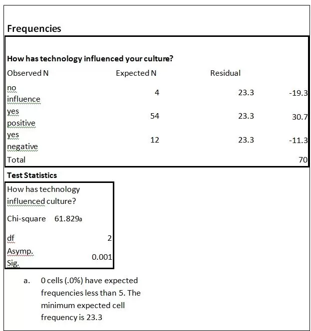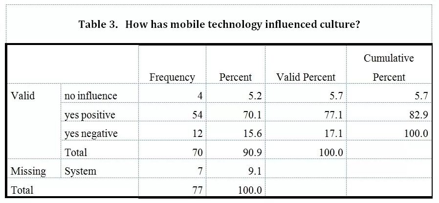 Table 3 below presents a frequency analysis of data on the influence of mobile technology on culture.