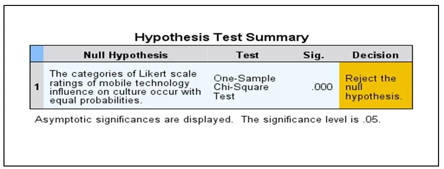 Table 6 above indicates that proportions of respondents who indicated that mobile technology has had an influence on culture and those whose view was that it has had no influence on culture significantly differ (based on Likert scale levels 1, 2, 4, and 5), hence the computed probabilities of occurrences for these categories are significant.