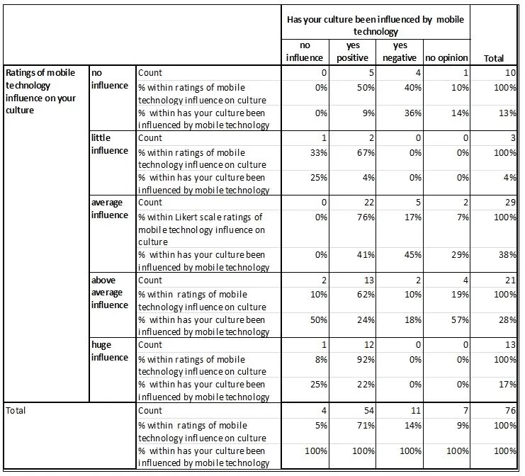 A cross tabulation analysis of the influence of mobile technology on culture from the perspective of culture attributes.