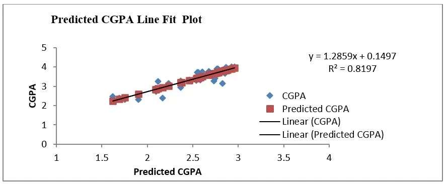 Figure 1 shows the regression plot of CGPA versus predicted CGPA. The R value for this plot is 0.905387 which indicates that the CGPA and the Predicted CGPA are strongly related. The R2 value in this plot is 0.8197 which shows that the regression predictions fit decisively.