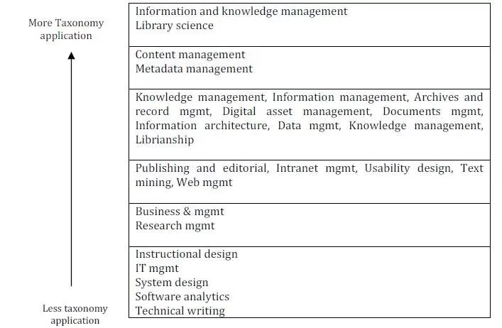 Taxonomy concept has been applied to wider disciplines and domains. Most taxonomy applications have been practiced in the area of content management and metadata management, followed by archives and records management, digital asset management, document management, information architecture and data management.