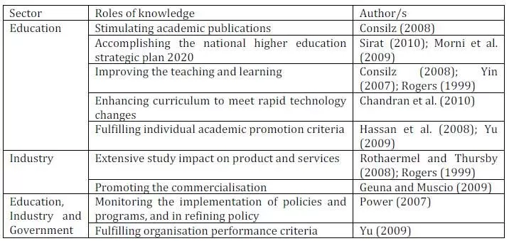 The researcher has found and analysed 14 academic articles that highlight the roles of knowledge in IHL. The results of analysis, organised by education, industry and government sectors, are depicted in Table 1.