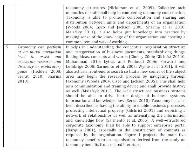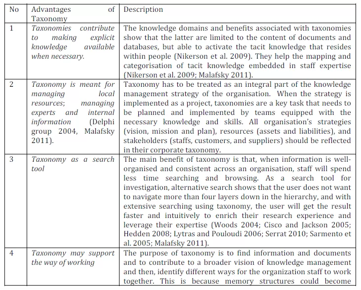 Taxonomy offers huge benefits and is crucial for the processing, storage, management and searching of knowledge in organisations (Subramaniam et al. 2010; Jung 2008). It has universal applications of grouping knowledge so that it can be systematically developed, stored and reused (Malafsky 2011). The following table elaborates on five advantageous points of taxonomy derived from the literature review.