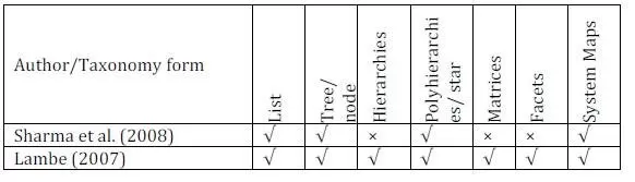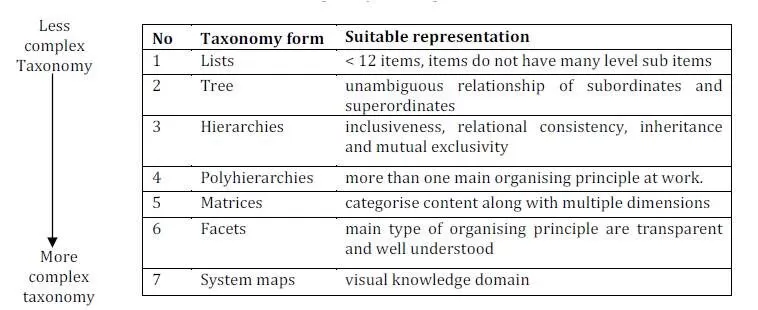 Lambe (2007) reveals additional three forms from Sharma et al. (2008) that are: hierarchies, matrices and facets. Each form has its own usage preference and level of complexity. The levels of complexity generally increase from list to system maps. Table 3 depicts the taxonomy forms (Lambe, 2007 and Sharma et al., 2008) and Table 4 summarises the representation levels of taxonomy forms (Lambe 2007).