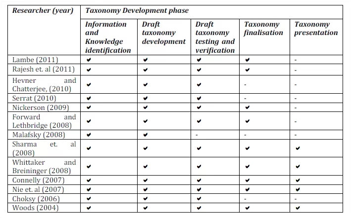 The simplest taxonomy development stages done by Malafsky 2008 consist of two levels: information and knowledge identification, and Draft taxonomy development, while Sharma et al. 2008, Whittaker and Breininger (2008), Connelly 2007, Nie et al. 2007& woods 2004 went through five levels of taxonomy development phases that are: i) Information and knowledge identification, ii) Taxonomy draft development, iii) Taxonomy draft testing and verification, iv) Taxonomy finalisation and finally v) Taxonomy presentation. Table 5 depicts the compilation taxonomy development phase from the literature.
