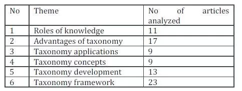 In this study, the researcher uses document analysis method to extract the literature review of taxonomy concept and approaches, and the knowledge organization and management of IHL. The articles from various journals, conferences, books and technical papers related to knowledge taxonomy and academic institutions were analyzed using thematic analysis. There are six themes analyzed and depicted in Table 6.