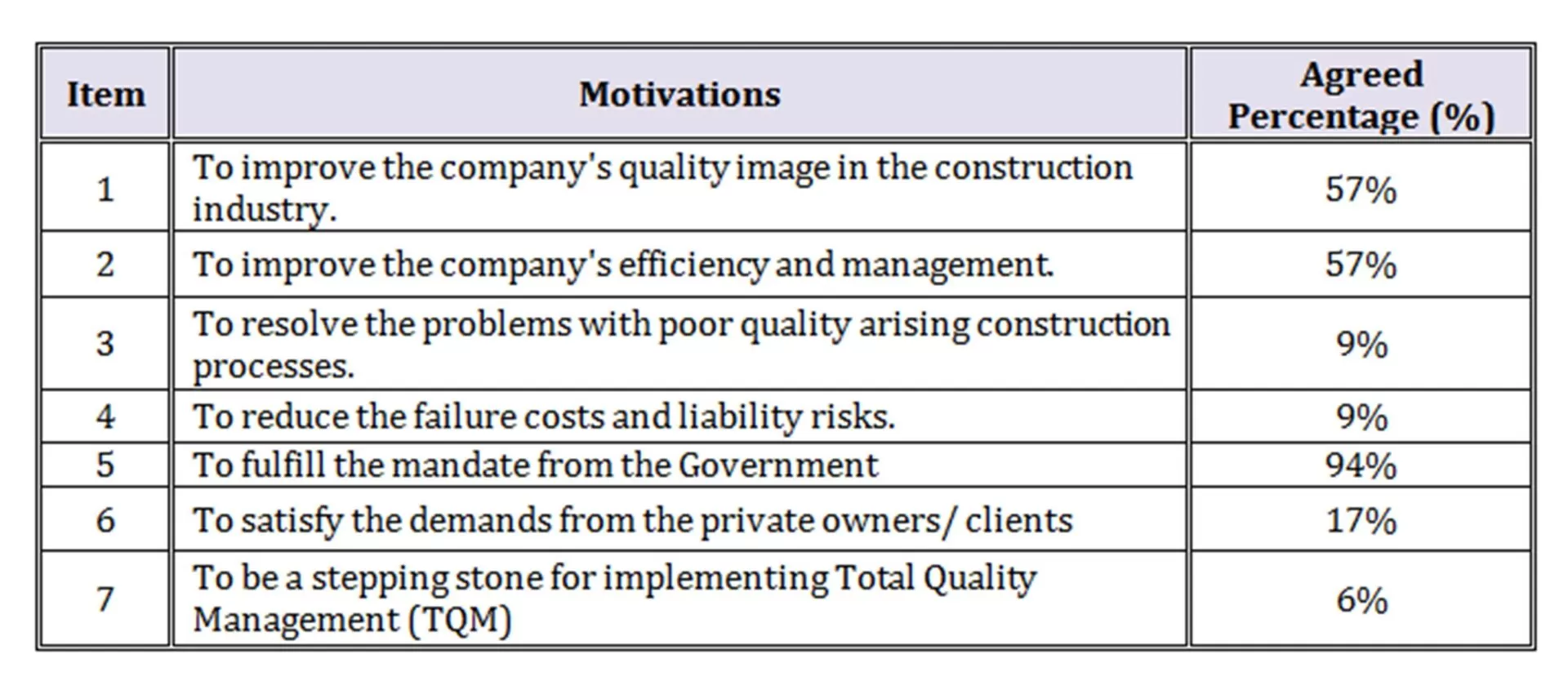 On the other hand, the survey conducted by Shaw (1995) on 35 selected contractors in investigating the original motivations in seeking a QMS certification also shows the positive effects of QMS implementation. The summary of the survey results is indicated in Table 1. From the results, five out of seven items, which are from item 3 to 7, provide the least motivations to the organizations. It is found by Shaw (1995) that the constructors failed to gain benefits due to wrong thinking on implementing the QMS, which is due to mainly the pressure of the government or clients in seeking qualified certification and the solution for the problems in cost, quality, risk and the like. Therefore, the overall benefits gained as a result of implementing the QMS have not been significant.