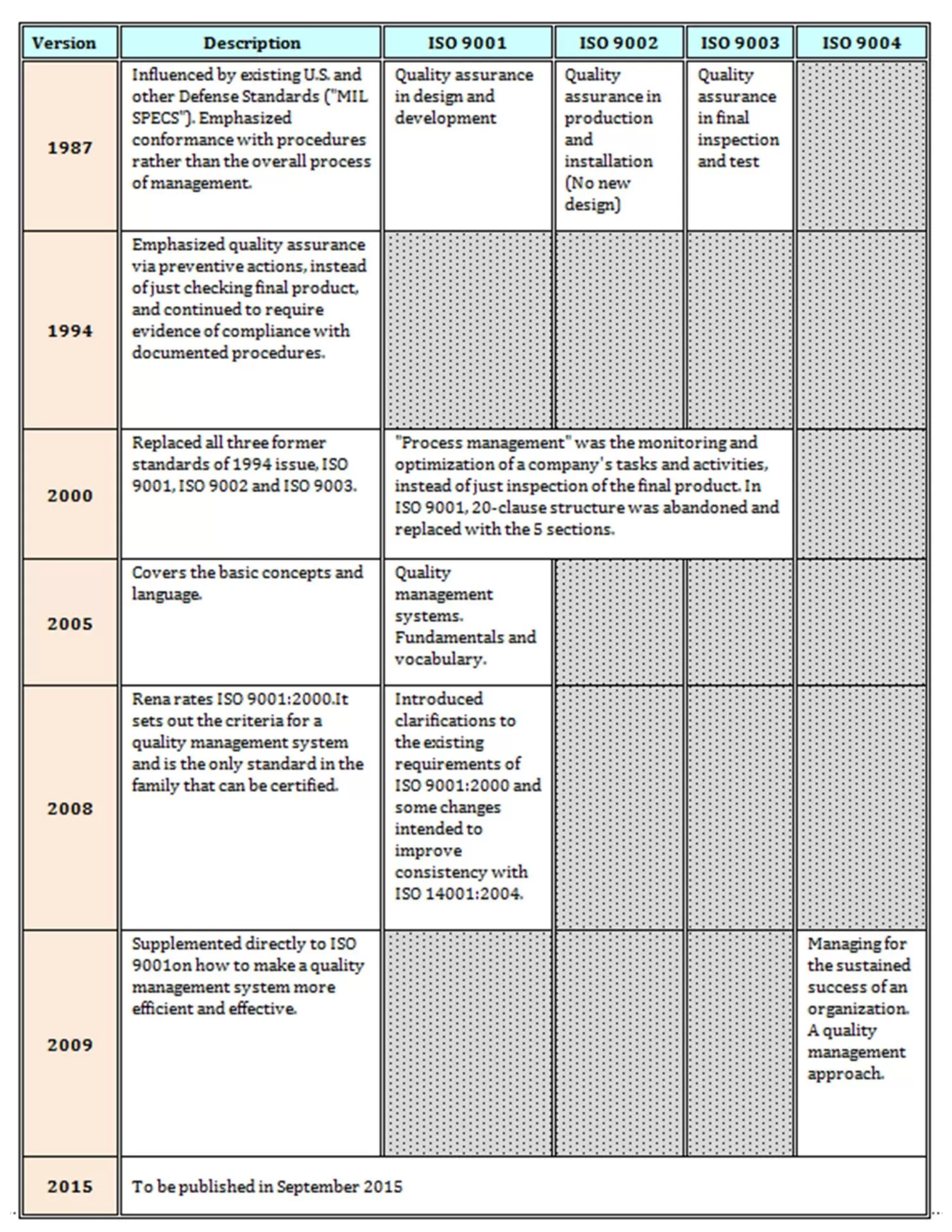 The ISO9000 series of standards have been widely implemented worldwide to an atmosphere of continual process improvement and customer satisfaction. There are many versions of the ISO series as shown in Table 3. For instance, the version 1987 emphasizes the conformance with procedures rather than the overall process of management; whereas the version 1994 emphasizes the quality assurance via preventive actions and continues to require evidence of compliance with the documented procedures. However, the version 2000 emphasizes the effectiveness via process performance metrics where require design and development procedures for new products creation with the involvement of top executives. The version 2008 only introduces clarifications to the existing requirements of ISO 9001:2000. Hence, the ISO9001:2008 establishes the requirements of a quality management system; ISO 9000:2005 covers the basic concepts and language; ISO 9004:2009 is designed to focus on how to make a quality management system more efficient and effective and ISO 19011:2011 sets out guidance on internal and external audits of quality management systems.