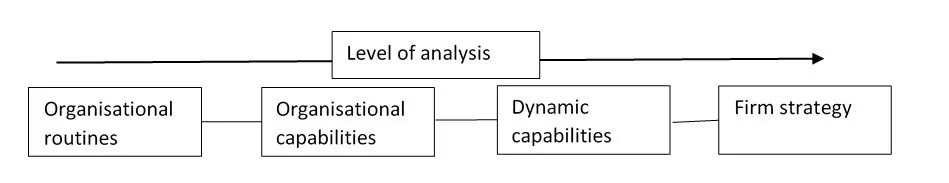 Organisational capabilities are larger scale units of analysis in comparison to organisational routines. Following Winter (2003, p.991), Felin et al. (2012) define organisational capability as ‘a high-level routine or collection of routines that together with its implementing input flows, confers upon an organisation’s management a set of decision options for producing significant outputs of a particular type’ (p.1355). Hence, organisational capabilities involve patterned activity which is oriented to relatively specific objectives. They entail deploying resources (inputs), usually in combination, and using organisational processes to produce a firm’s outputs that matter for an organisation’s survival and prosperity. While (operational) capabilities enable an organisation to earn a living at present, dynamic capabilities concern change, as they include: a capacity to identify the need or opportunity for change, to respond to such a need or opportunity and implement a course of action. Hence, they extend, modify or create (ordinary) capabilities (Winter, 2003). They are crucial for developing and maintaining a competitive advantage of the firm and thus have a direct link to the firm’s strategy.