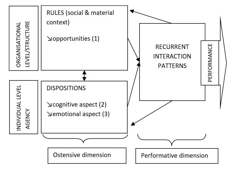 An ostensive part of a routine refers to the abstract aspect of the routine stored in people’s mind, i.e. an idea, how to act. The performative part is an enactment of the ostensive part in particular time and space. In other words, while the ostensive dimension of a routine is the abstract and generalised understanding of the routine (usually plural, as the understanding of a routine may differ across an organisation), the performative dimension designates a specific action taken by specific people at specific times (Salvato & Rerup, 2011). They are mutually constitutive, with the performances creating and recreating the ostensive aspect and ostensive aspect constraining and enabling the performances (Becker, 2020). A routine does not exist without being enacted, at most we can call it an aspirational or espoused routine.