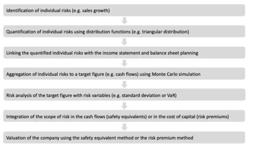 In these methods, the effects of the individual risks of the SME (taking correlations into account) are allocated to the corresponding items of the budgeted income statement and budgeted balance sheet as part of planning in line with expectations (Ernst and Häcker, 2024). The risk effects of the individual risks (e.g. sales fluctuations) are described by probability distributions (e.g. a triangular distribution, PERT distribution or normal distribution). Many thousands of future scenarios are run through in independent simulation runs as part of a Monte Carlo simulation (Gleißner, 2004, p. 355). The entirety of all simulation runs forms a representative sample of all possible risk-related future scenarios for the income statement and balance sheet. The target variables of the simulation are, for example, the cash flows. Aggregated frequency distributions can be determined from the determined realizations of the target figures. Based on the frequency distribution of the cash flows, risk measures can now be calculated which are based on the actual risk scope of the cash flows. The most frequently used risk measures are the standard deviation or the value at risk. Safety equivalents and risk-adequate capital costs can be derived from the results of the risk analysis. In the safety equivalent method, also known as the risk discount method, a risk discount is first deducted from the expected value of the cash flow in the numerator. The resulting certainty equivalents are then discounted at the risk-free interest rate to obtain the enterprise value. In the risk premium method, which is widely used in practice, the expected value of the cash flow without a risk discount is used in the numerator. This is then discounted using the risk-adjusted cost of capital from the risk analysis and the enterprise value is calculated. Figure 1 shows the process of simulation-based business planning and business valuation (see Ernst (2022b), p.99).