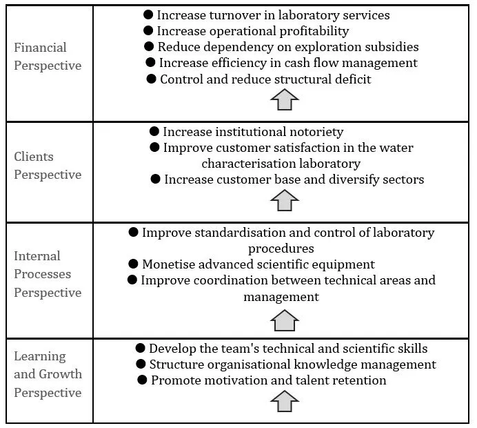 This study aimed to propose a BSC, including a strategy map, adapted to the reality of a non-profit organisation with a scientific and technological mission. The research enabled an in-depth understanding of the organisation’s internal challenges, designing a strategic model consistent with its mission and context, and developing practical tools to support management based on financial and non-financial information. Using a qualitative approach based on data collected through semi-structured interviews, it was possible to map out the organisation’s needs and priorities.