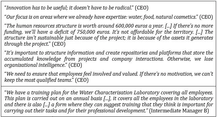 Table 3: Excerpts from the interviews that support the objectives: internal processes perspective