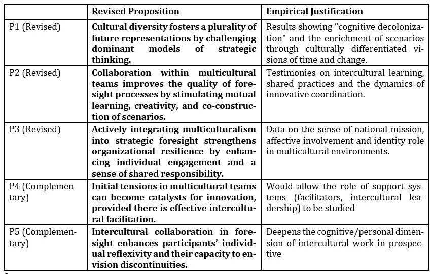 The research contributes to filling a notable gap in literature, by articulating a conceptual framework that bridges organizational foresight, intercultural theory, and resilience studies. It advances five empirically grounded propositions that can guide further theoretical development and practical applications within foresight and innovation strategy fields. These propositions reinforce the idea that intercultural foresight is not only more inclusive, it is also more robust and better equipped to anticipate discontinuities in a complex world.