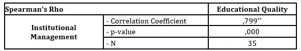 Regarding the general objective, the result is a p-value of 0.000 that is less than 0.05, therefore, Spearman’s Rho coefficient is statistically significant. On the other hand, Spearman’s Rho coefficient is 0.799. The positive sign of the coefficient indicates that there is a moderate positive correlation between the institutional management variable and the educational quality variable; this means that, by reinforcing institutional management, educational quality is improved as shown below: