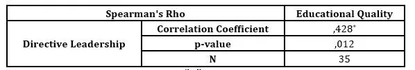 Regarding the third specific objective: Analyze the relationship between managerial leadership and educational quality; It is observed that p-value is 0.012, which is less than 0.05, therefore, Spearman’s Rho coefficient is statistically significant. On the other hand, Spearman’s Rho coefficient is 0.428. The positive sign of the coefficient indicates that there is a moderate positive correlation; this means that, by improving effective leadership, educational quality is improved.