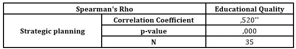 Regarding the fourth specific objective: Analyze the relationship between strategic planning and educational quality; It is observed that p-value is 0.000 which is less than 0.05, therefore, Spearman’s Rho coefficient is statistically significant. On the other hand, Spearman’s Rho coefficient is 0.520. The positive sign of the coefficient indicates that there is a moderate positive correlation; this means that, by reinforcing strategic planning, educational quality is improved.