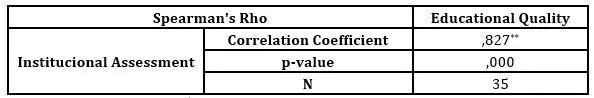 Finally, in relation to the sixth specific objective, we can conclude that a high positive correlation (0.827) was evident between institutional evaluation and educational quality, with the p-value (0.000) of the correlation hypothesis test being less than 0.05; so, the correlation is significant.