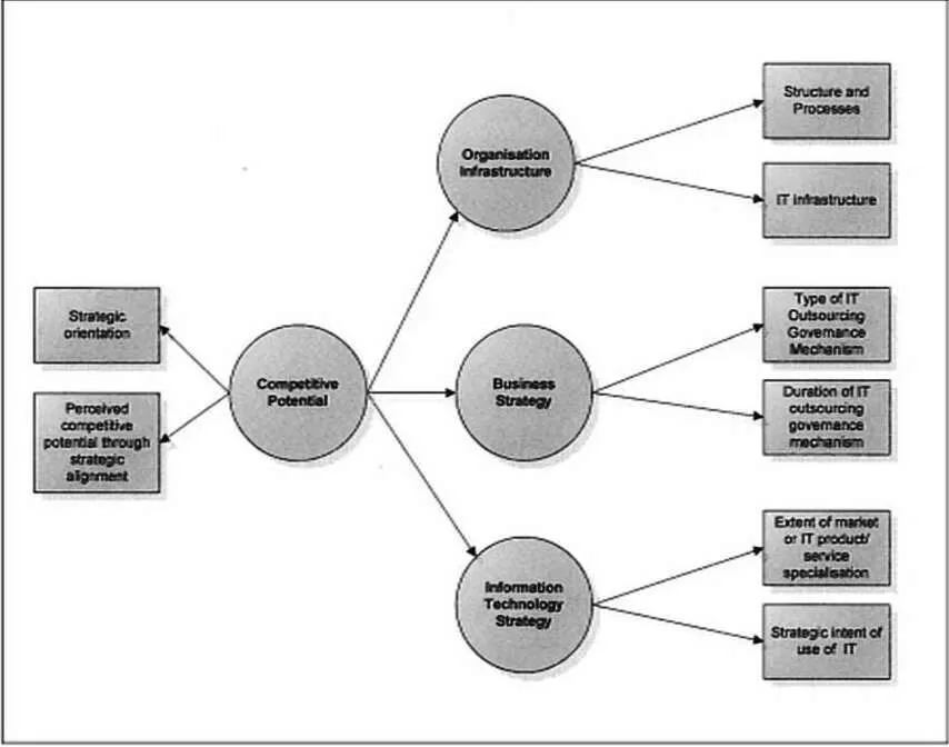 Competitive potential is often viewed as a key objective to be achieved from IT outsourcing arrangements within organisations (Kudelski et al., 2005) and reported to positively relate to business performance (Hartog and Herbert, 1986; Neiderman et al., 1991; Kearns and Lederer, 2000). van Dijk (2000) defines it as the ‘capacity to gain, maintain and expand its share in markets for final products’. Henderson and Venkatraman’s Strategic Alignment Model (1993) views competitive potential as a business perspective that focuses on how emerging information technologies applied by a firm’s top management can influence and enable new business strategies within firms (Papp, 2001), leading to competitive advantage (Barua et al, 1995; Katz, 1993; LaPlante, 1994). The changes in the business strategy are in turn claimed to have an impact on the firm’s business (organisational) infrastructure (Henderson & Venkatraman, 1993; Luftman, Lewis & Oldach, 1993).