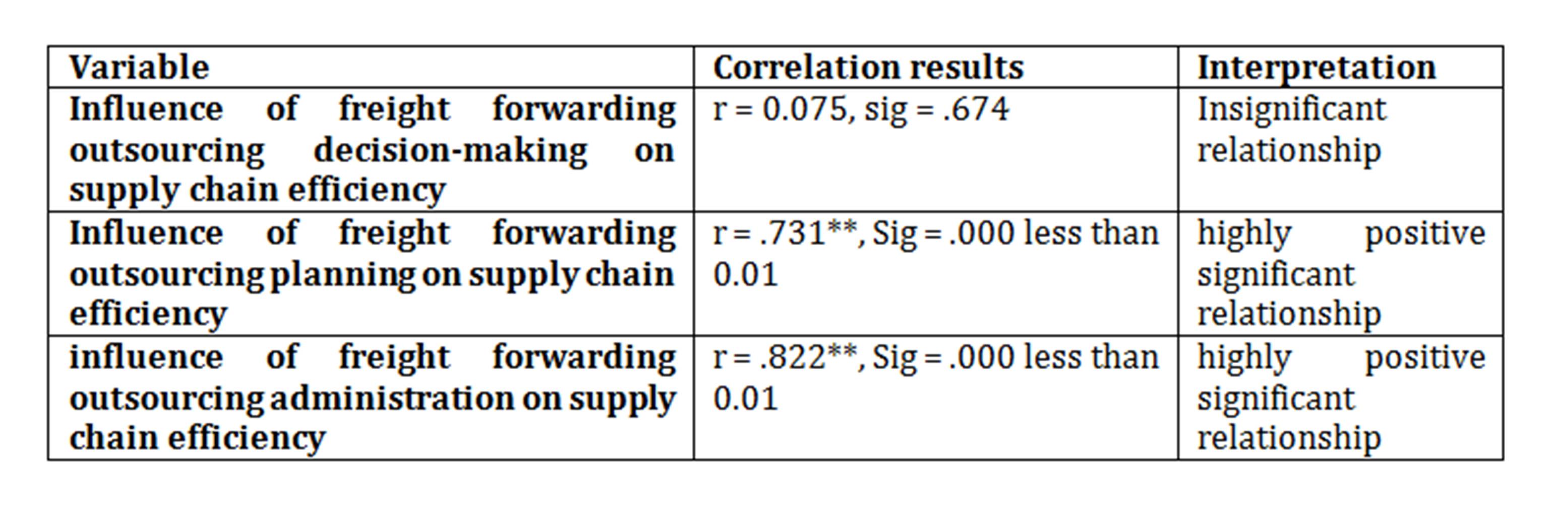 The third objective of the study was to examine the extent to which freight forwarding outsourcing administration influences Supply chain efficiency. The findings of the study revealed that the respondents agreed that freight forwarding outsourcing administration has enabled Mukwano Industries to reduce legal costs, information costs, idle time costs, overheads and rental costs, finance costs, procurement process time, time to market, shipment transit time, increased service quality, cost and precision expectations, product availability, complete delivery of orders, increased safety of orders in transit, with a mean of 3.4 , clearly indicating a highly positive significant relationship between freight forwarding outsourcing administration and Supply chain efficiency of the organization. The results from the correlational coefficients are summarized below: