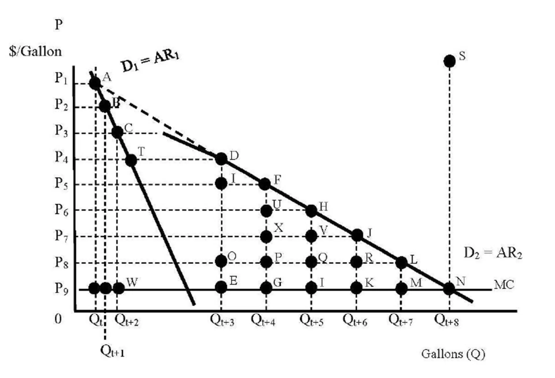 7Incremental variable profit (Δπ) = (P-MC) ΔQ. I ignore residual consumer surplus. For example, I ignore area (DFI) + area (FHU) + area (HJV) + area (JLR). This residual consumer surplus results from discontinuities in gasoline quantities as these quantities represent different consumer groups based upon their purchase timing decisions. If Figure 3 was a model of a monopolist practicing perfect first-order price discrimination, all residual consumer surplus would be eliminated because the monopolist could charge each and every individual customer a different price for each marginal quantity (gallon) of gasoline sold, e.g. quantities between Qt+3 and Qt+4, and Qt+4 and Qt+5, etc. Total variable profit is the sum of all Δπ’s. Total Profit = Total variable profit — Total fixed costs.