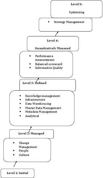 The proposed EBI2M consists of five levels namely; initial, managed, defined, quantitatively managed and optimizing; all of which are adapted from CMMI maturity levels. There are thirteen key process areas, namely; change management, culture, strategic management, process, people, performance management, balanced scorecard, information quality, data warehousing, master data management, analytical, infrastructure and knowledge management.