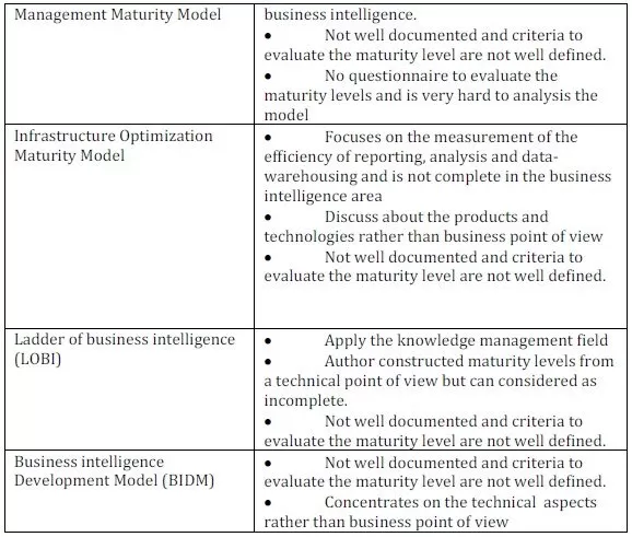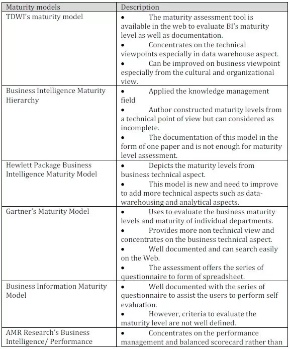 Table 1 above depicts summary of various business intelligence maturity models. As shown in the table 1, the majority of the models do not focus the business intelligence as entire which some of models focus on the technical aspect and some of the models focus on business point of view. For example, TDWI’s model only concentrates on the data warehousing while Business Intelligence Maturity Hierarchy only concentrates on knowledge management. It is not complete to represent business intelligence. We know that business intelligence covers not only data warehousing, but also business performance, balanced scorecard, analytical components. In addition, the documentation of some maturity models above is not well defined and they do not provide any guidelines or questionnaire to evaluate maturity levels.
