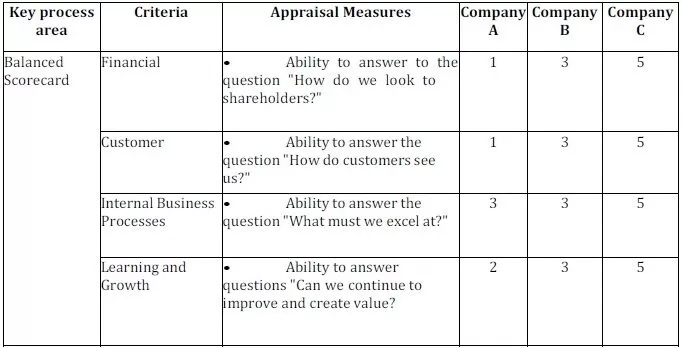 Table 10 depicts the capabilities levels among three companies in balanced scorecard perspective. The overall score for company A, B and C is 1.75, 3 and 5 respectively. Company A is lowest capacities among company B and C in balanced scorecard perspective.