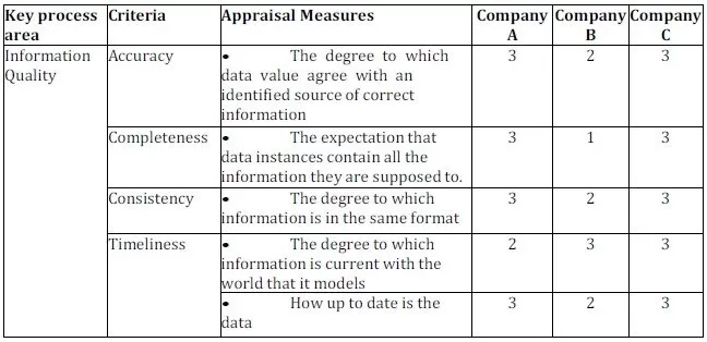 Table 11 depicts the capabilities levels among three companies in information quality perspective. The overall score for company A, B and C is 2.88, 1.88 and 3 respectively. Company B is lowest capacities among company A and C in information quality perspective.
