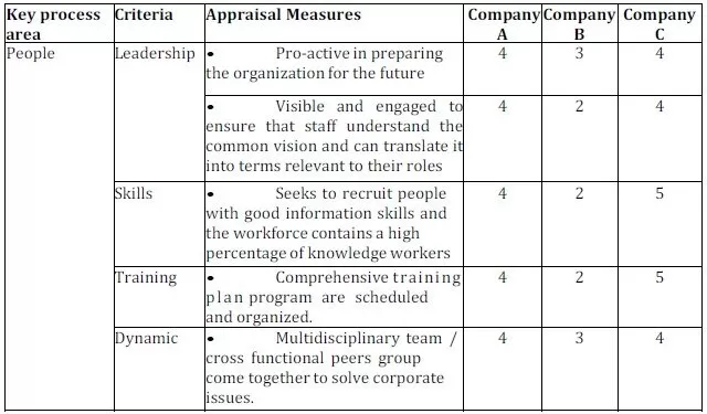 Table 12 depicts the capabilities levels among three companies in people perspective. The overall score for company A, B and C is 4, 4.38 and 4.5 respectively. Company A is lowest capacities among company B and C in people perspective.