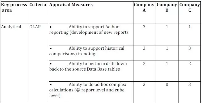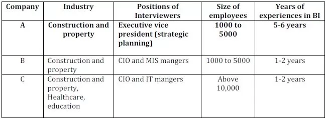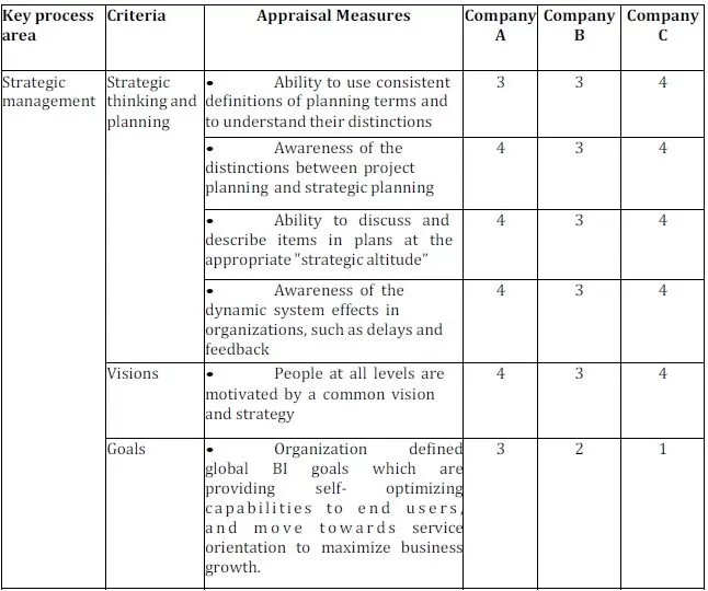 Table 3 depicts the capabilities levels among three companies in data warehouse perspective. As shown in table 3, Company B has lowest capacities in term of ETL and data marts. This is might be due to lack of top management support and lack of experience among IT developers in the company B.